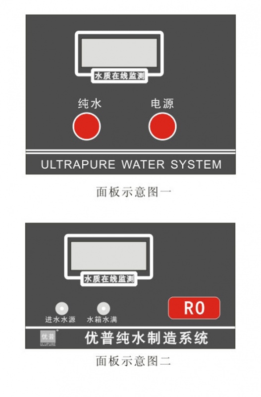 (4)純水取用:輕按“RO”或“純水”按鈕,則RO取水閥打開。從主機前左側取水嘴即可取用純水,出水量為每分鐘1.5~1.8升(Ⅱ型機可同時在控制面板上部的水質在線監測儀顯示此時管路內的純水電導率),再輕按“RO”按鈕即可停止取用純水。(見面板示意圖)