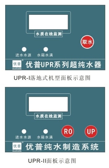 (6)輕按控制面板“RO”取水按鍵或“UP”取水按鍵,便可從主機(jī)取二級(jí)RO純水和UP超純水。(UPR-II機(jī)型)